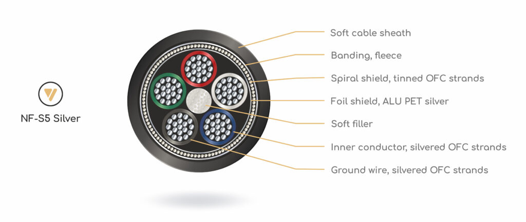 The five internal conductors of the VIABLUE™ NF-S5 enable a variety of configuration and connection options, including DIN, DIN 90 plugs, RCA, and XLR connectors.