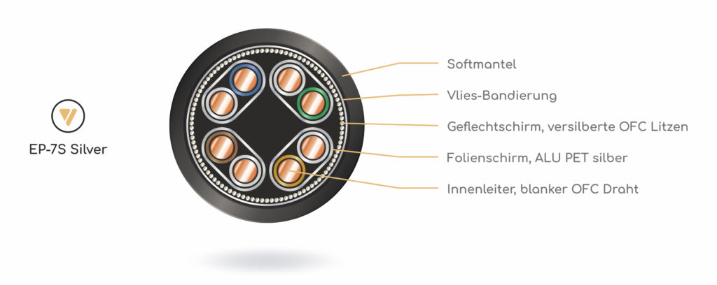 VIABLUE™ EP-7S CAT7 Silver Netzwerkkabel sind Twisted-Pair-Datenleitungen mit vollständigem Schutz sensibler Dateninhalte vor äußeren Störeinflüssen. Unsere Lösung für eine professionelle Gigabit-Hochgeschwindigkeits-Vernetzung zum effizienten und verlustfreien Streamen von HD-Audio- und UHD-Videoformaten.