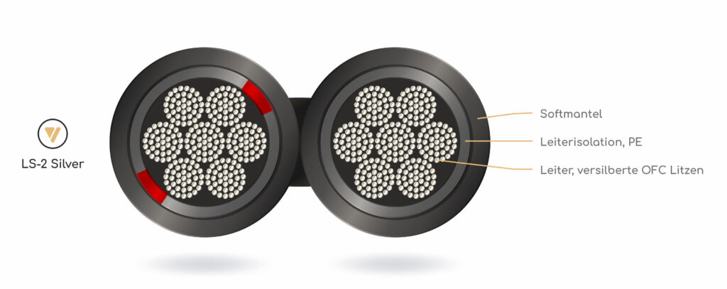 VIABLUE™ LS-2 Silver Lautsprecherkabel ist mit drei verschiedenen Querschnitten erhältlich: 2x 1,5 mm², 2x 2,5 mm² und 2x 4,0 mm² Adern. Zwei mit einem Trennsteg verbundene, flexible Adern mit versilberten OFC Litzen und zusätzlicher Isolationsschicht bieten eine naturgetreue und vollständige Klangwiedergabe.