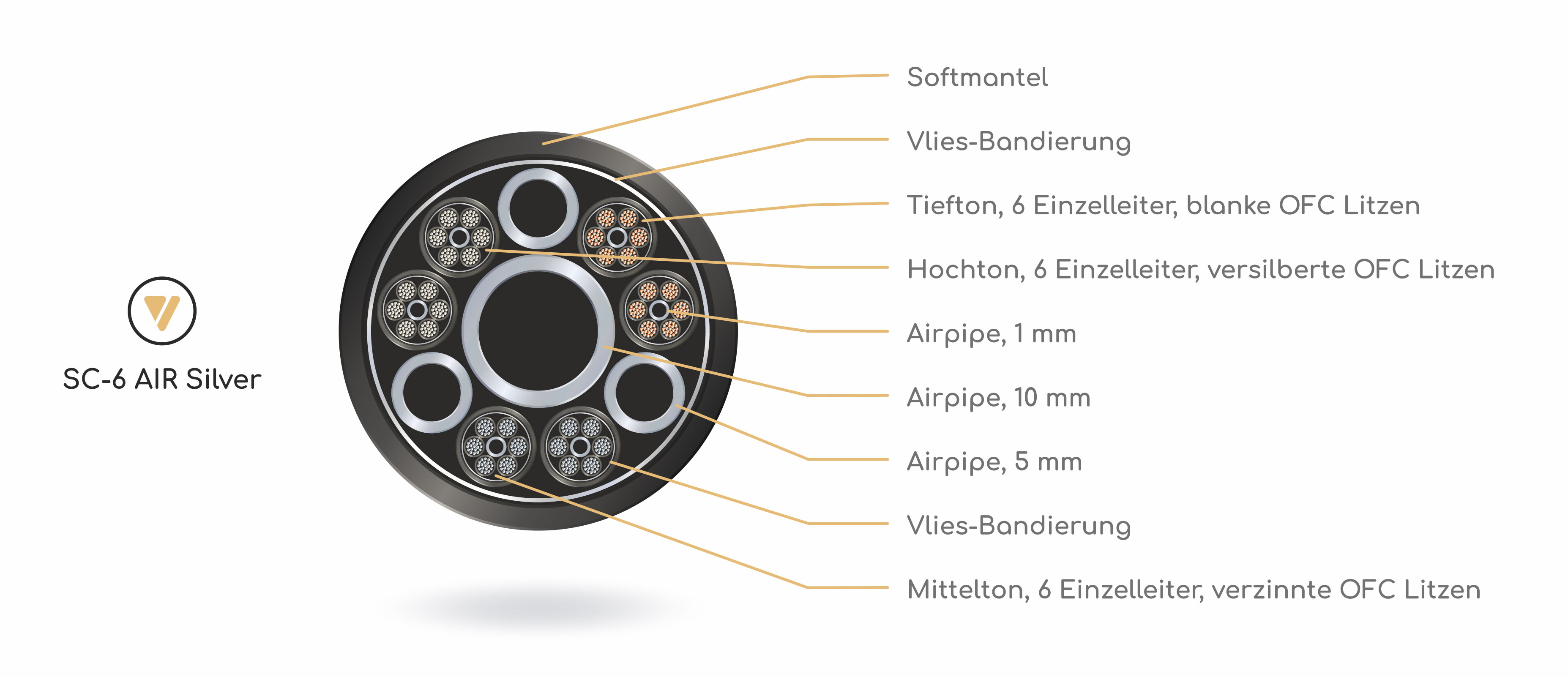 6 Einzeladern in kreisförmiger Anordnung um eine Airpipe übertragen die drei Frequenzbereiche Hoch-, Mittel- und Tiefton isoliert voneinander. Jede dieser 6 Einzeladern ist unterteilt in weitere 6 Einzelleiter, die ebenfalls kreisförmig um zusätzliche Airpipes angeordnet sind.