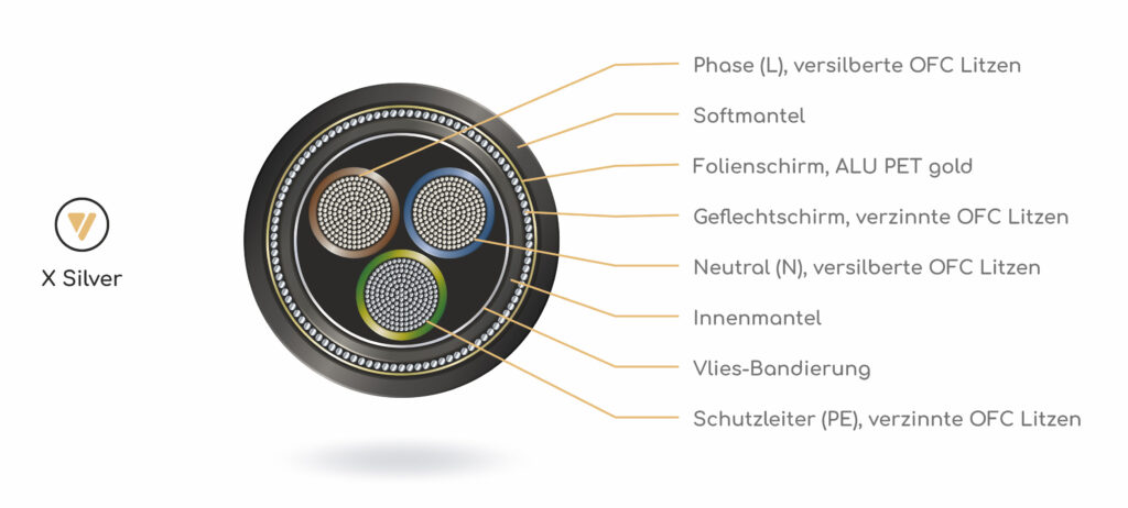 • Versilberte OFC Kupferlitzen (braun, blau)