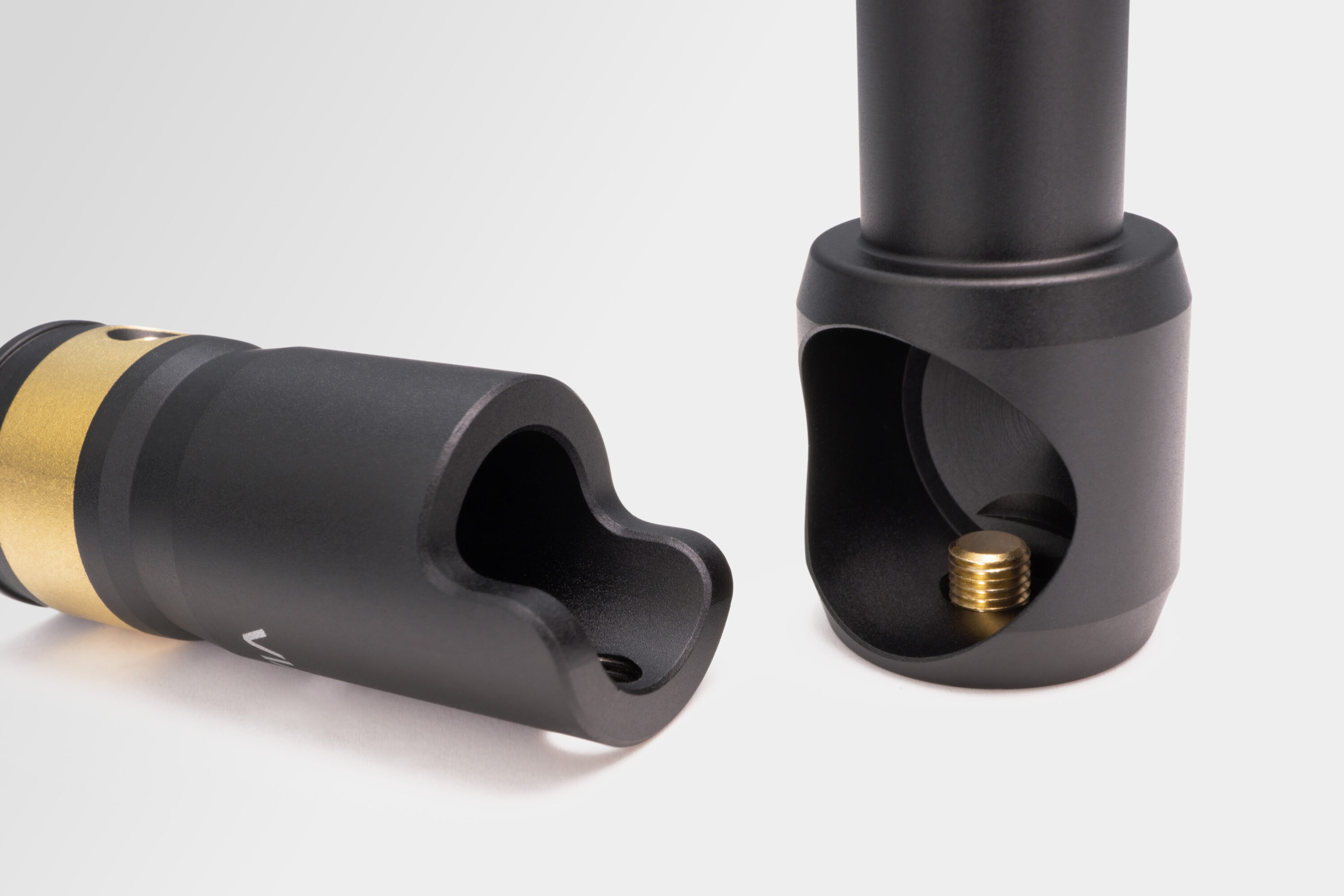 • Zweiteiliger, komplett geschlossener Massekörper für komplette Abschirmung und idealen Kontakt. Zwei Zugentlastungsschrauben geben dem Kabel sicheren Halt.