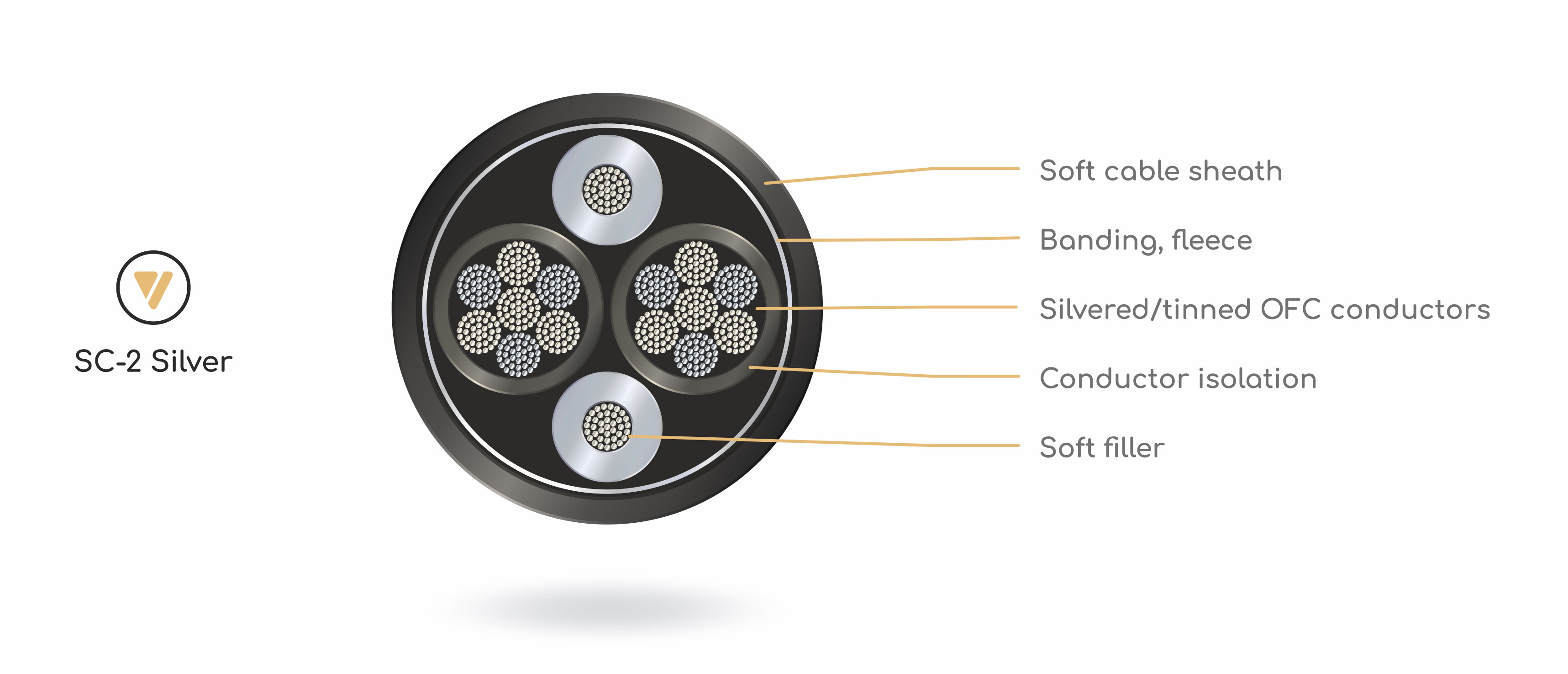 VIABLUE™ SC-2 Silver-Series speaker cables consist of 2x 4mm² conductors. Each one includes a combination of silvered and tinned OFC copper strands. Silvered strands provide a brilliant and precise high frequency rendition, as well as 3D acoustics. The tinned OFC strands guarantee powerful and vibrant basses. All frequencies are represented and reproduced in a linear fashion true to the original.